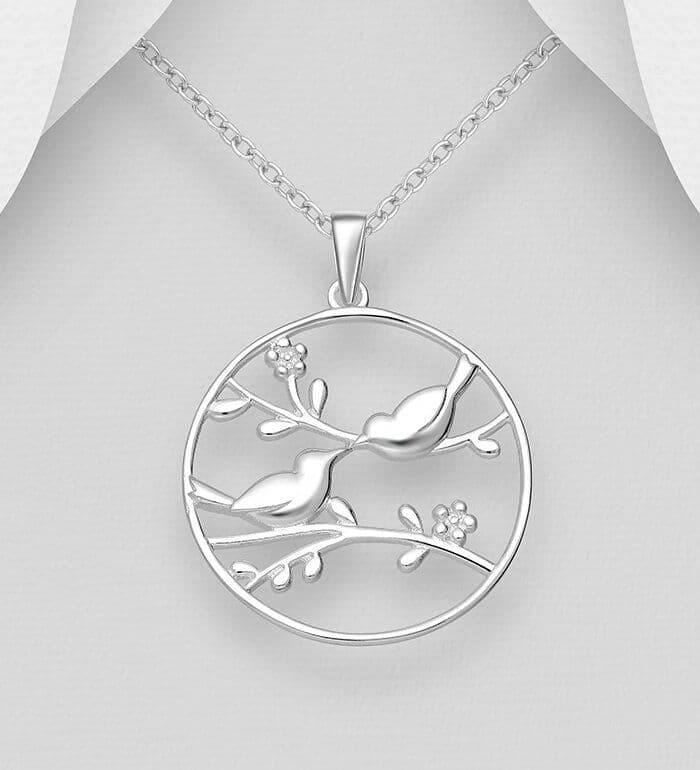 925 Sterling Silver Love Birds on Branch Pendant & Chain