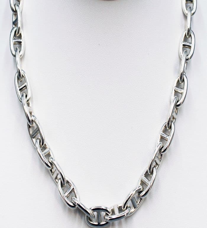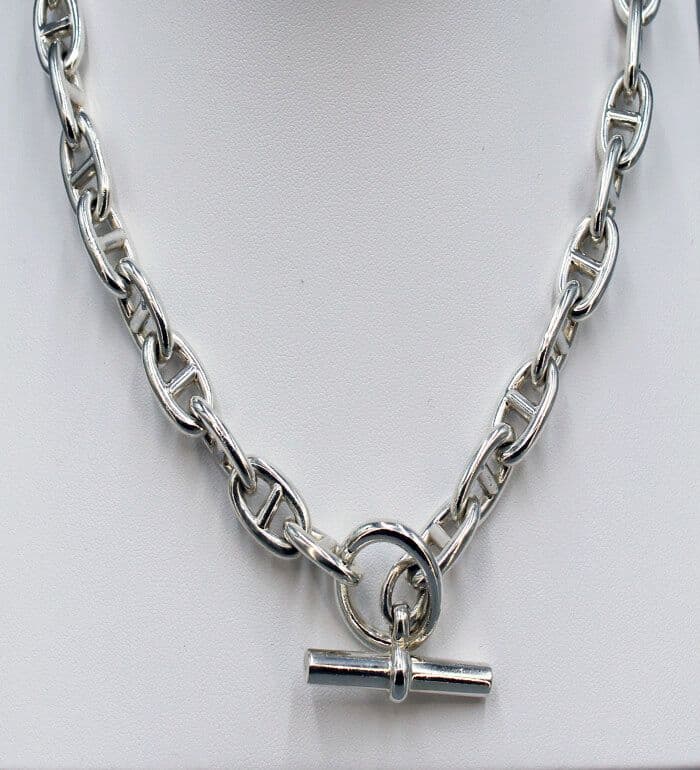Update your jewelry collection with this exquisite 925 sterling silver necklace. Each link has been meticulously handcrafted for a solid and polished finish. The T-bar clasp adds a touch of elegance and convenience. Inspired by the iconic Hermes style, this necklace exudes luxury and sophistication. Indulge in quality and style with this designer necklace.