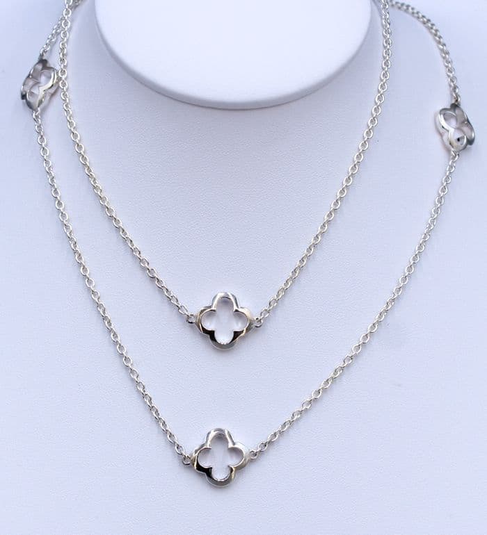 Enhance your look with our exquisite solid 925 sterling silver necklace, inspired by Van Cleef designs. This linked necklace is available in a longer length to suit your preference. Elevate your style with this sophisticated piece.
